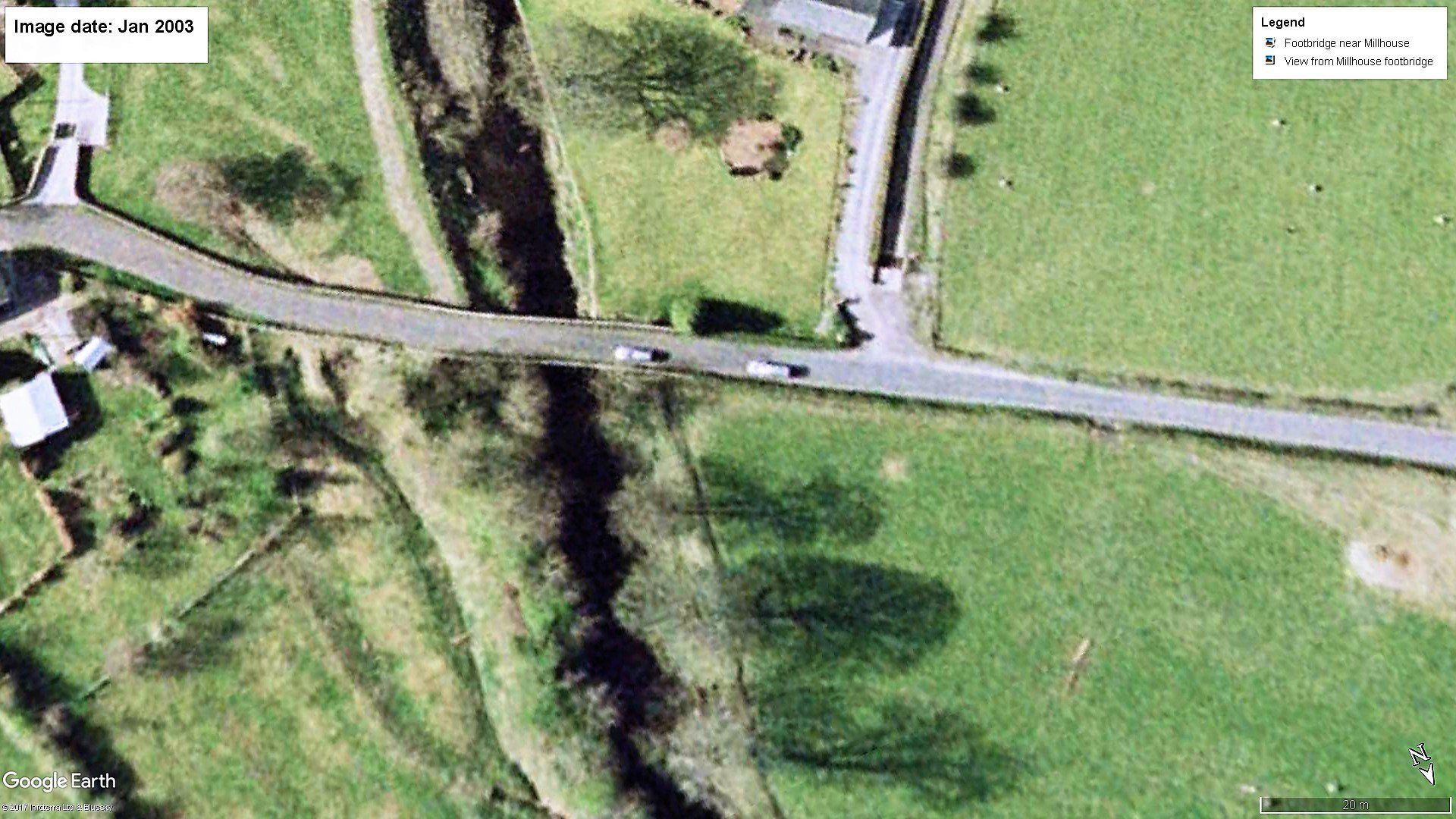 The aerial photo below was taken in 1997 prior to the errection of the obstructing wall and raised drive. During these times, when the bridge became overwelmed the overflowing river used to free-flow across the road into the ajacent field.