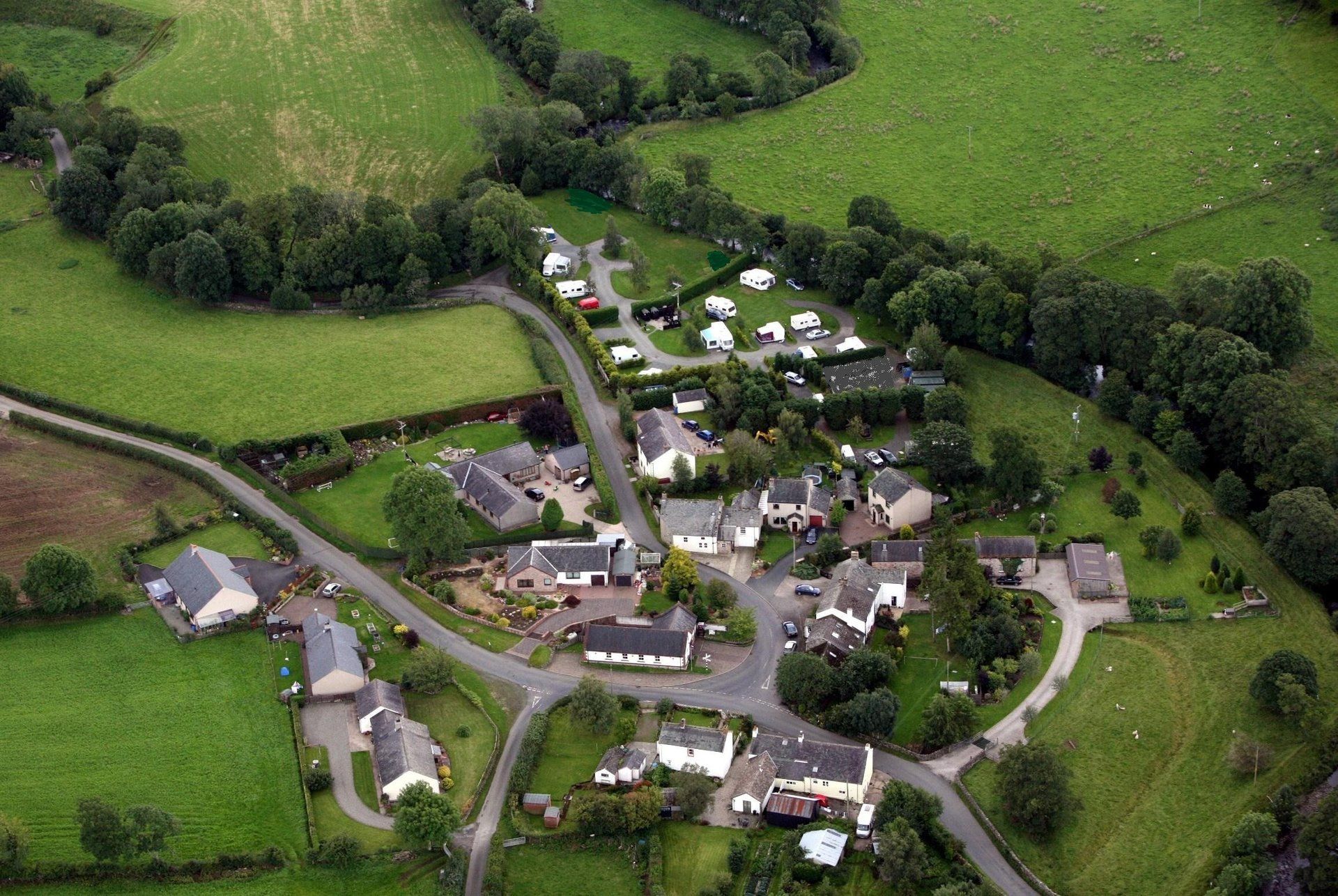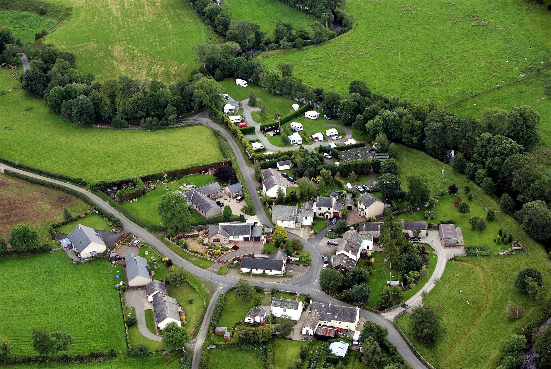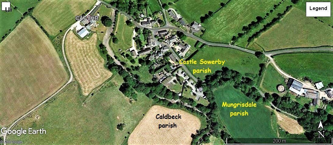 is at the border line junction of not just one, but 2 other parishes. The river Caldew is one of the borders, the Gillcambon beck the other. If you stand at the junction of the two rivers in the caravan park, (being in Castle Sowerby parish) you can throw a stone over the Caldew to land in Caldbeck parish, and then throw a stone over the Gillcambon beck to land in Mungrisdale parish.